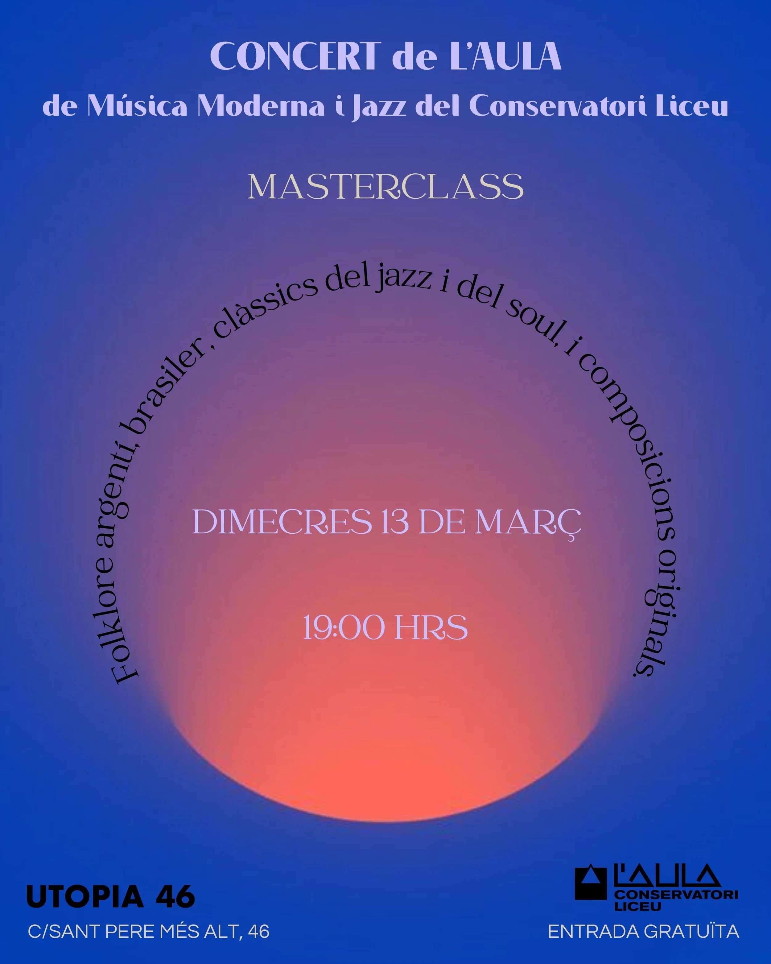 Amb motiu de la Setmana Cultural del Centre Professional del Conservatori Liceu, l'AULA de Música Moderna i Jazz oferirà un concert a càrrec de professors i alumnes.